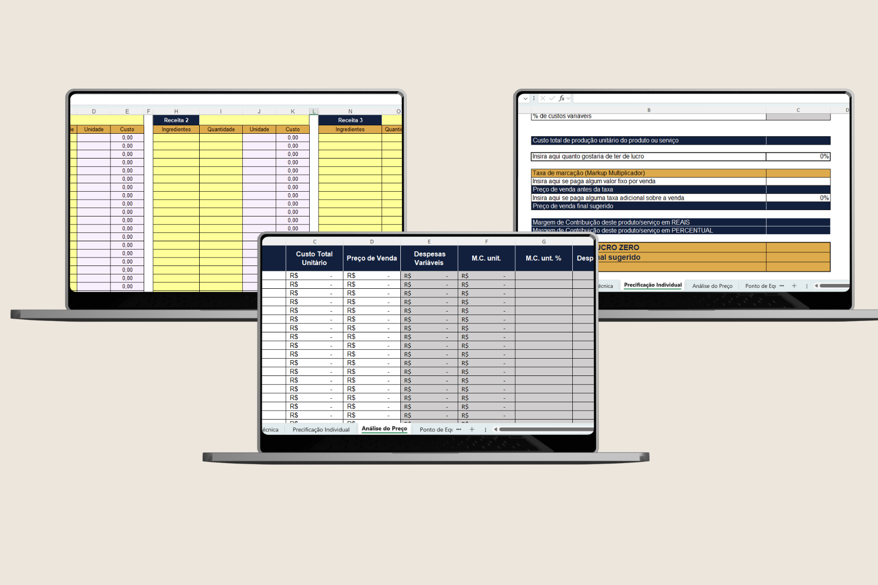 Planilhas automatizadas e prontas para você aplicar o que aprendeu no curso de forma rápida e prática, evitando erros e garantindo clareza sobre custos, preços e margem de lucro.
